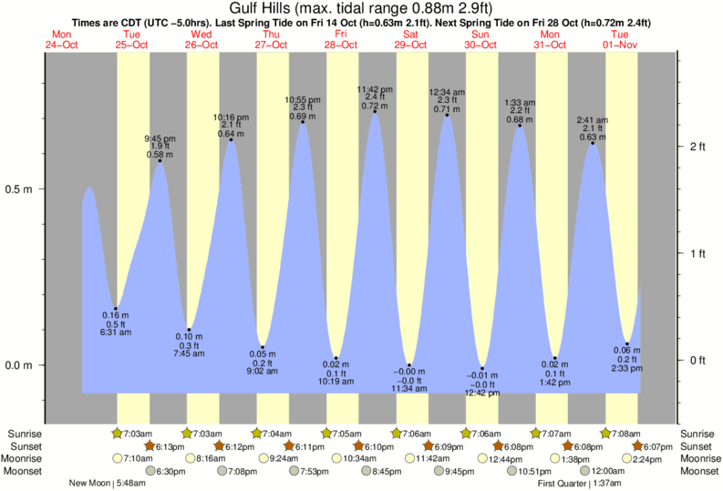 Tide Times are CST (UTC -6.0hrs). Last Spring High Tide at Gulf Hills was on Fri 05 Dec (height: 0.81m 2.7ft). Next high Spring Tide at Gulf Hills will be on Fri 02 Jan (height: 0.80m 2.6ft).