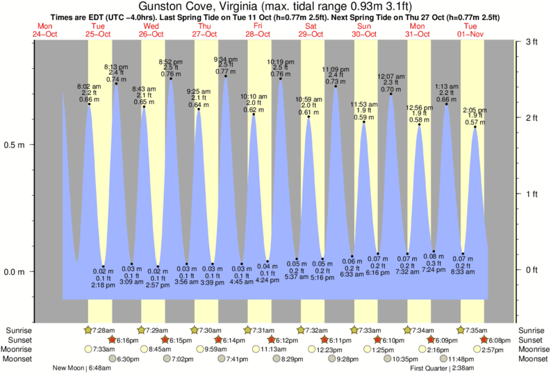 Gunston Cove tide chart key: The tide chart above shows the height and times of high tide and low tide for Gunston Cove, Virginia. The grey shading corresponds to nighttime hours between sunset and sunrise at Gunston Cove.