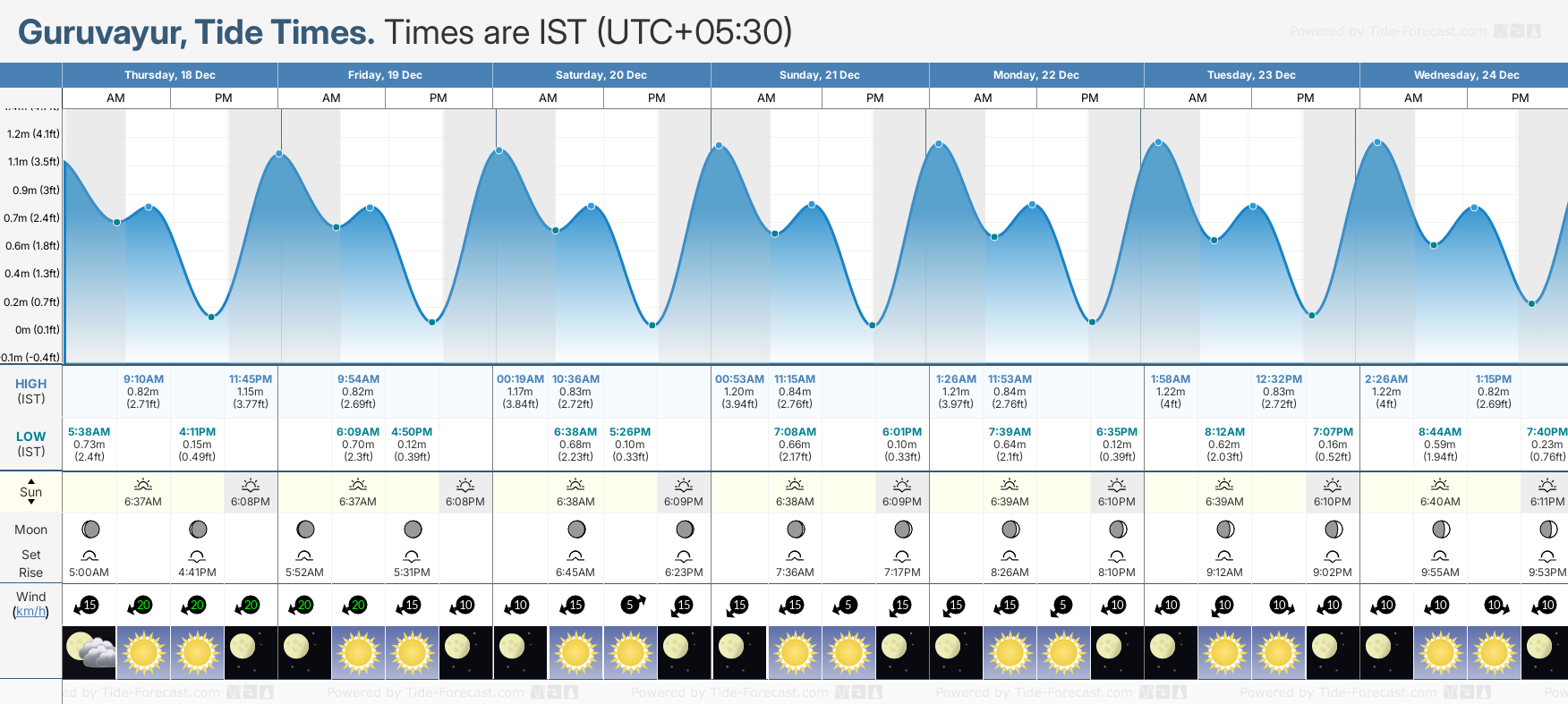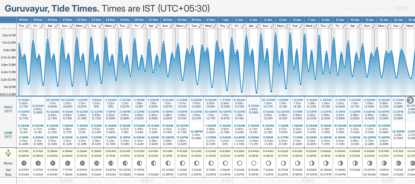 December and January Tide charts for Guruvayur: The tide charts below show the height, time and date of high and low tides for the next 30 days.