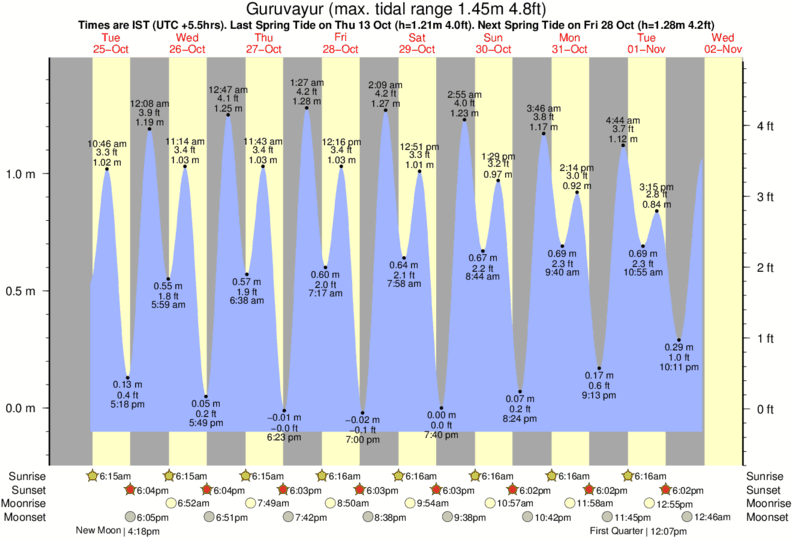 Tide Times are IST (UTC +5.5hrs). Last Spring High Tide at Guruvayur was on Sat 06 Dec (height: 1.34m 4.4ft). Next high Spring Tide at Guruvayur will be on Tue 23 Dec (height: 1.22m 4.0ft).