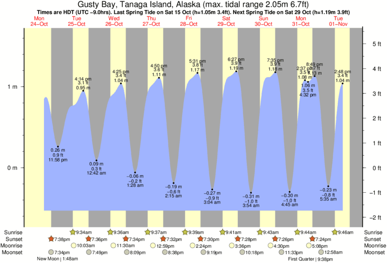 Tide Times are HST (UTC -10.0hrs). Last Spring High Tide at Gusty Bay, Tanaga Island was on Fri 05 Dec (height: 1.47m 4.8ft). Next high Spring Tide at Gusty Bay, Tanaga Island will be on Thu 01 Jan (height: 1.52m 5.0ft).