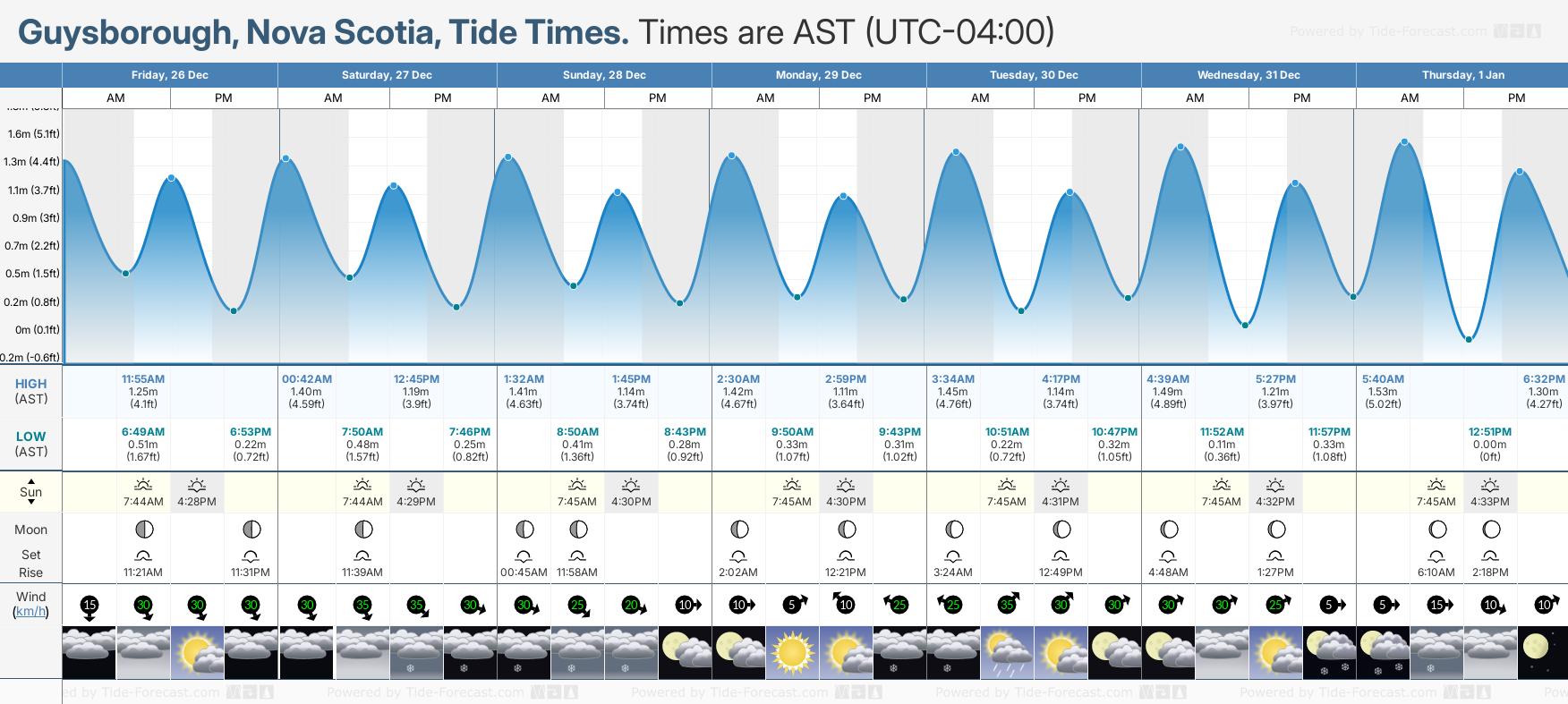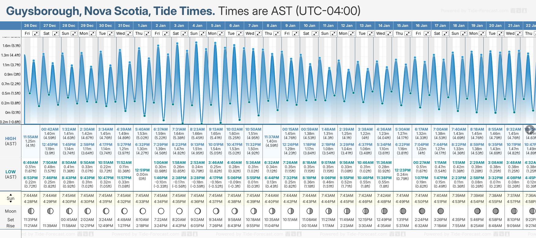 December and January Tide charts for Guysborough: The tide charts below show the height, time and date of high and low tides for the next 30 days.