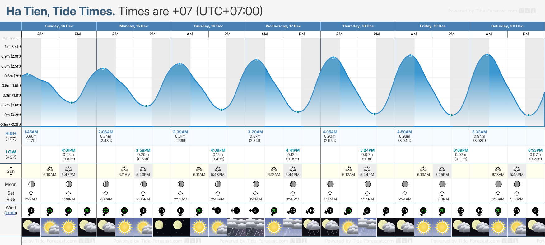 December and January Tide charts for Ha Tien: The tide charts below show the height, time and date of high and low tides for the next 30 days.