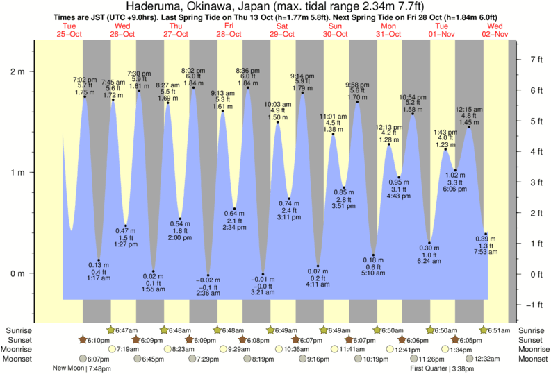 Tide Times are JST (UTC +9.0hrs). Last Spring High Tide at Haderuma was on Sun 07 Dec (height: 1.85m 6.1ft). Next high Spring Tide at Haderuma will be on Tue 23 Dec (height: 1.59m 5.2ft).