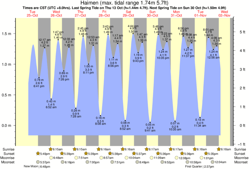 Tide Times are CST (UTC +8.0hrs). Last Spring High Tide at Haimen was on Sat 06 Dec (height: 1.73m 5.7ft). Next high Spring Tide at Haimen will be on Sun 04 Jan (height: 1.68m 5.5ft).