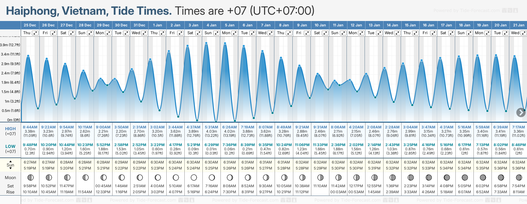 December and January Tide charts for Haiphong: The tide charts below show the height, time and date of high and low tides for the next 30 days.