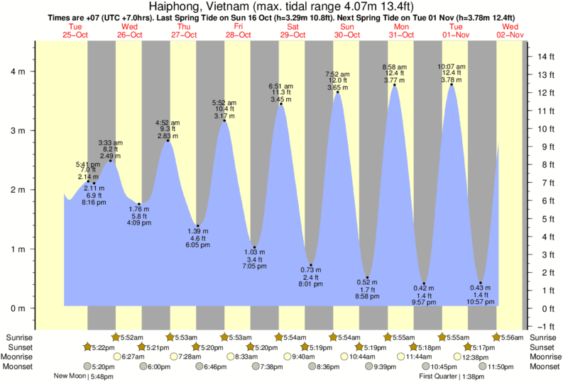 Tide Times are +07 (UTC +7.0hrs). Last Spring High Tide at Haiphong was on Mon 08 Dec (height: 4.14m 13.6ft). Next high Spring Tide at Haiphong will be on Tue 23 Dec (height: 3.47m 11.4ft).