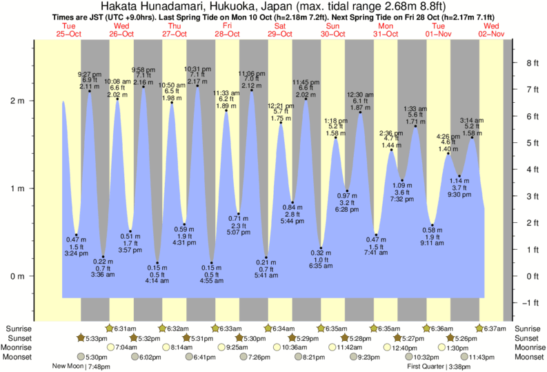 Tide chart for Hakata HunadamariShowing low and high tide times for the next 30 days at Hakata Hunadamari. Tide Times are JST (UTC +9.0hrs).