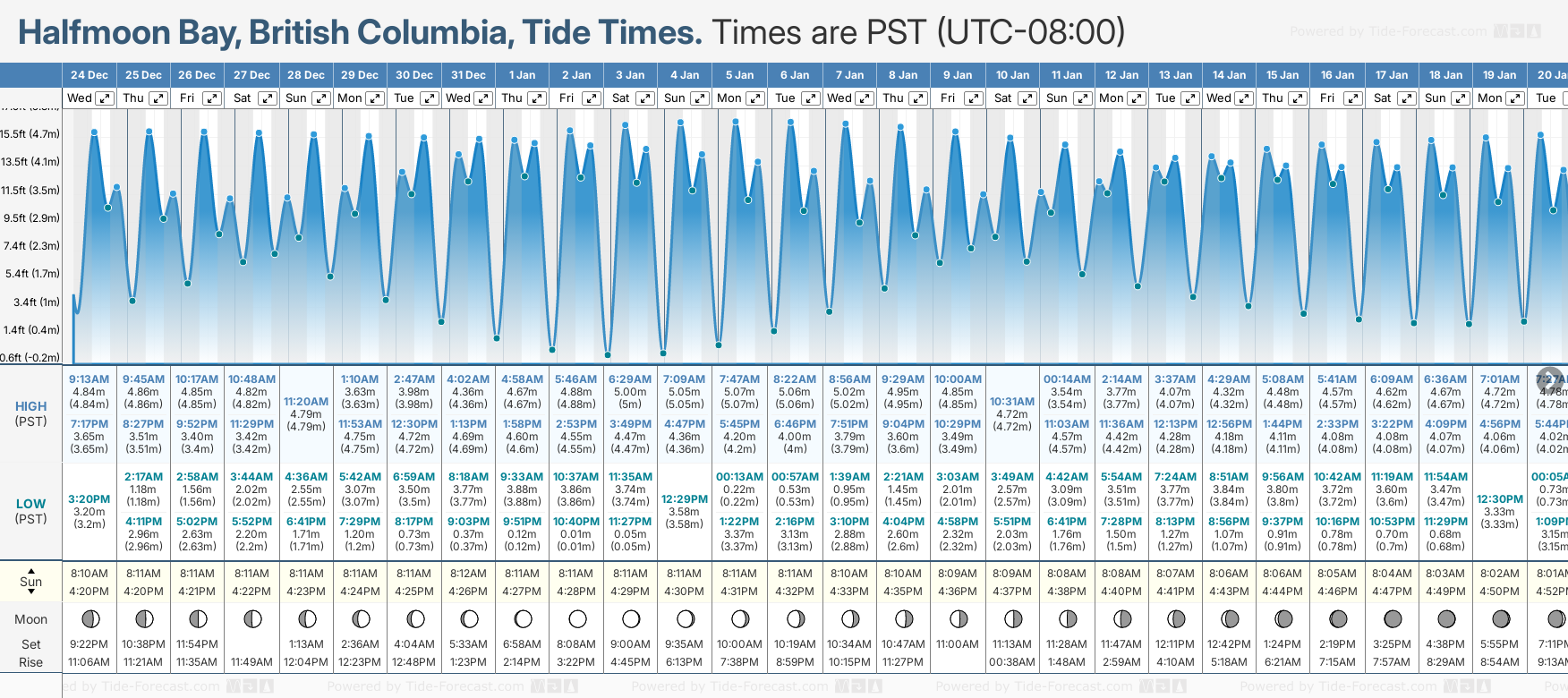 Tide Times are PST (UTC -8.0hrs). Last Spring High Tide at Halfmoon Bay was on Sun 07 Dec (height: 5.04m 16.5ft). Next high Spring Tide at Halfmoon Bay will be on Thu 25 Dec (height: 4.86m 15.9ft).