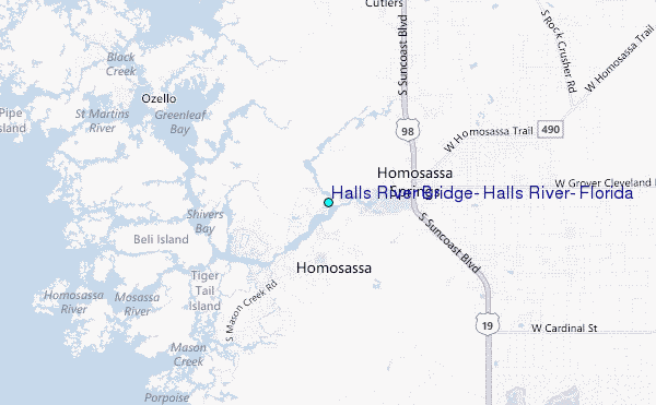 Use this relief map to navigate to tide stations, surf breaks and cities that are in the area of Halls River Bridge, Halls River, Florida.