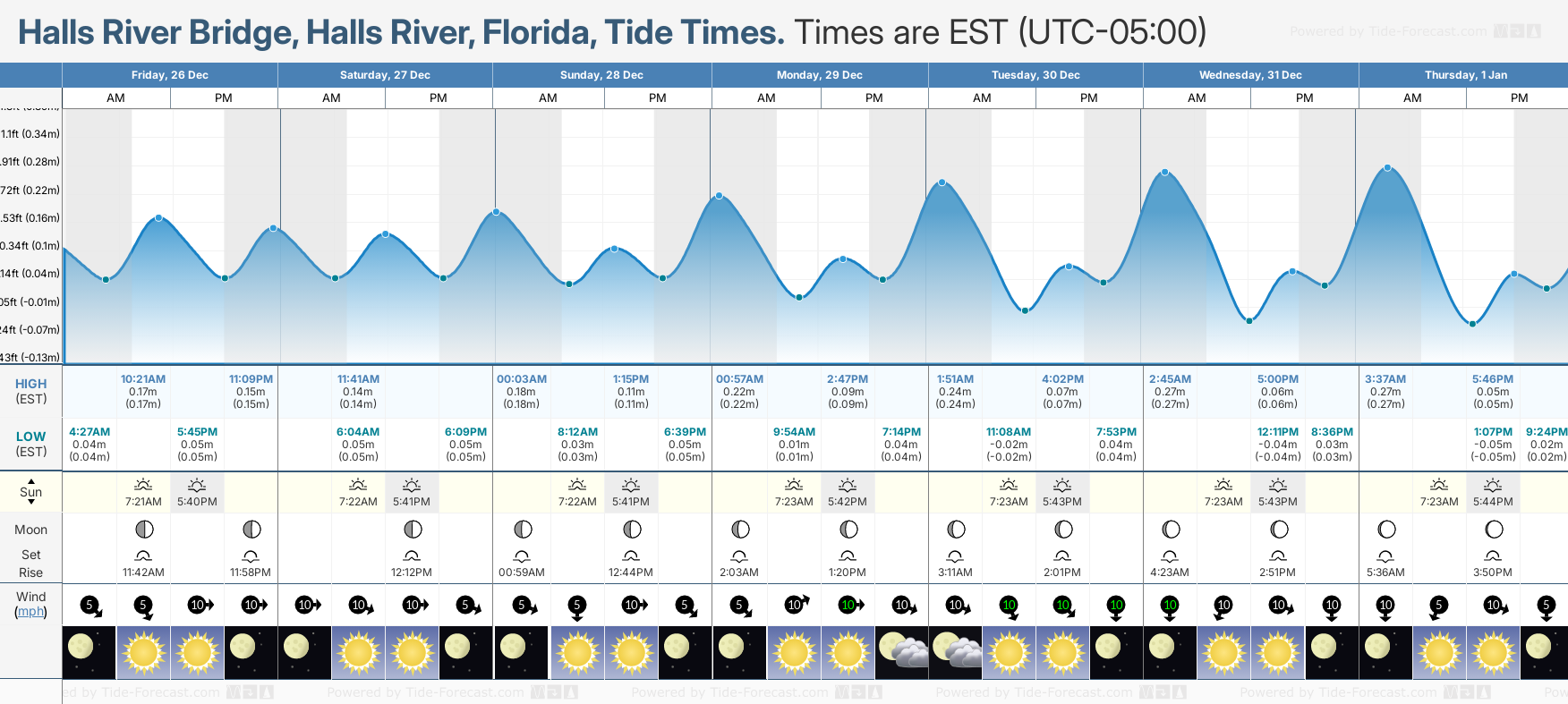 December and January Tide charts for Halls River Bridge, Halls River: The tide charts below show the height, time and date of high and low tides for the next 30 days.