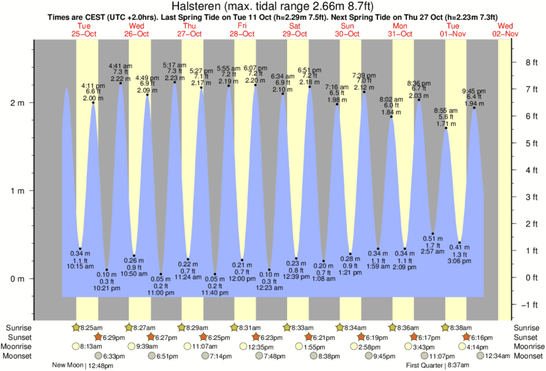 Tide Times are CET (UTC +1.0hrs). Last Spring High Tide at Halsteren was on Sun 07 Dec (height: 2.65m 8.7ft). Next high Spring Tide at Halsteren will be on Mon 22 Dec (height: 2.27m 7.4ft).
