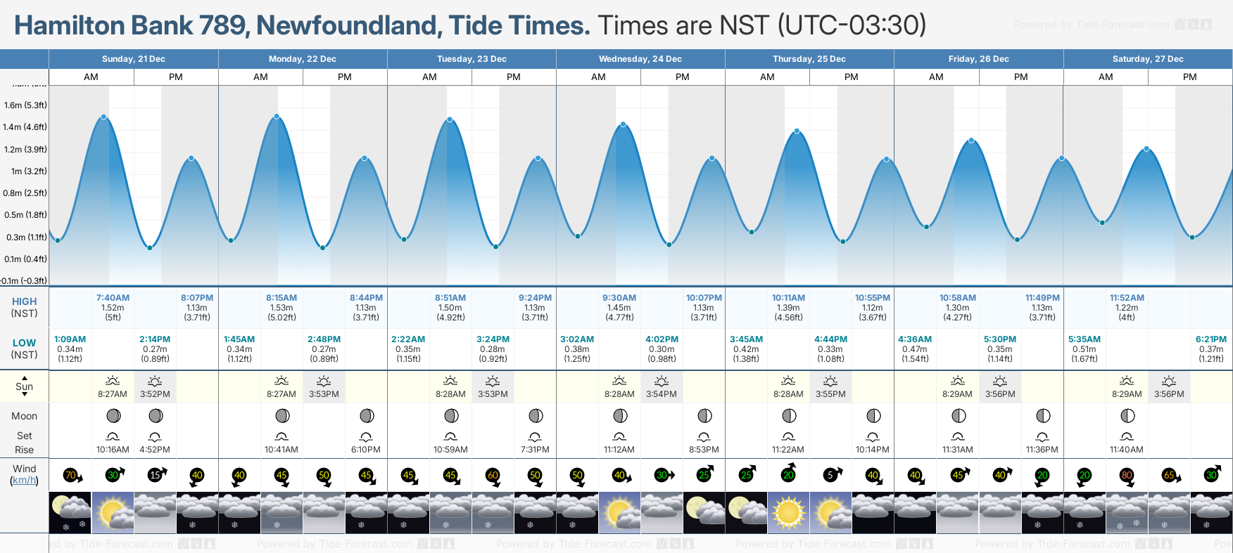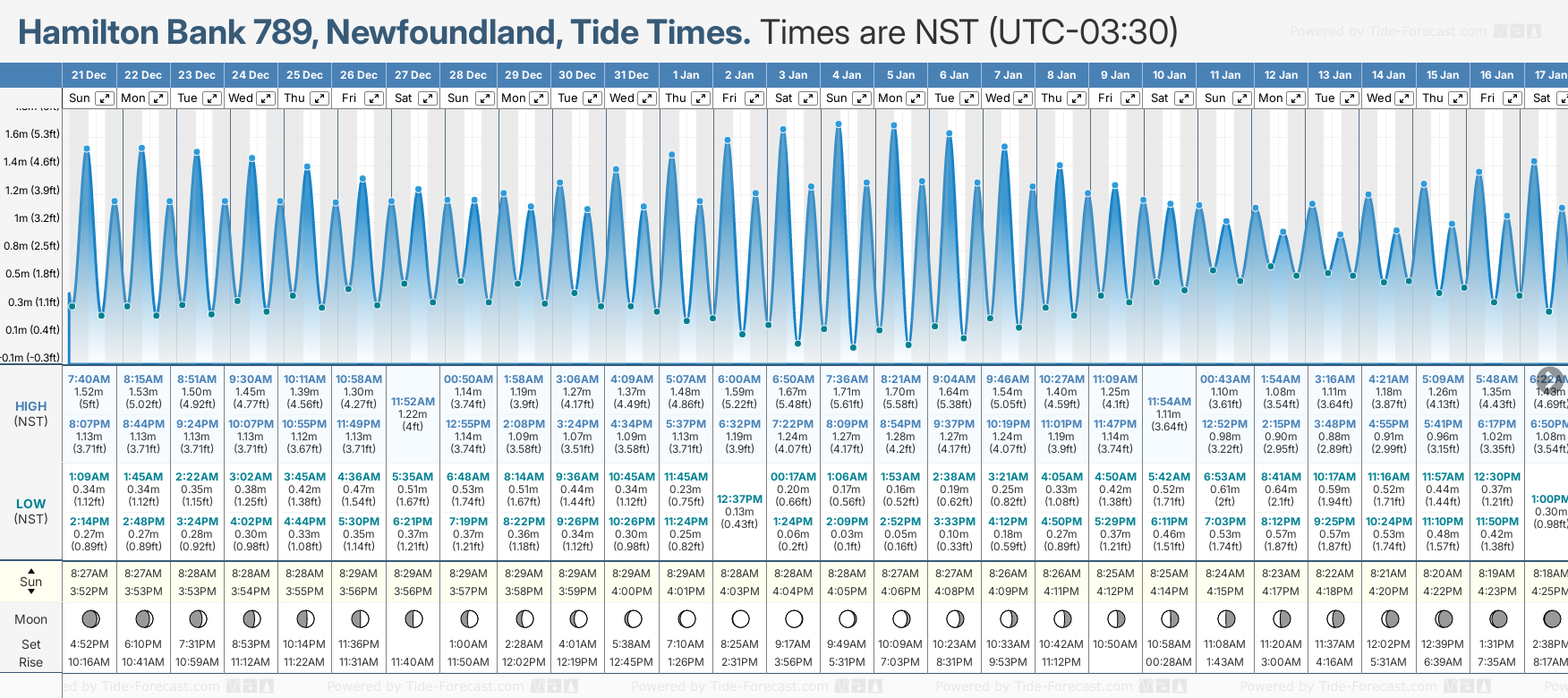 Tide chart for Hamilton Bank 789Showing low and high tide times for the next 30 days at Hamilton Bank 789. Tide Times are NST (UTC -3.5hrs).