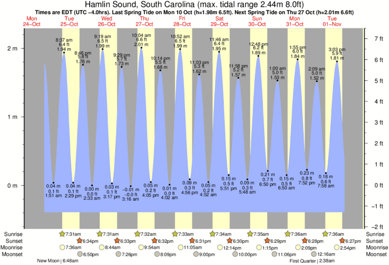 Hamlin Sound tide chart key: The tide chart above shows the height and times of high tide and low tide for Hamlin Sound, South Carolina. The grey shading corresponds to nighttime hours between sunset and sunrise at Hamlin Sound.