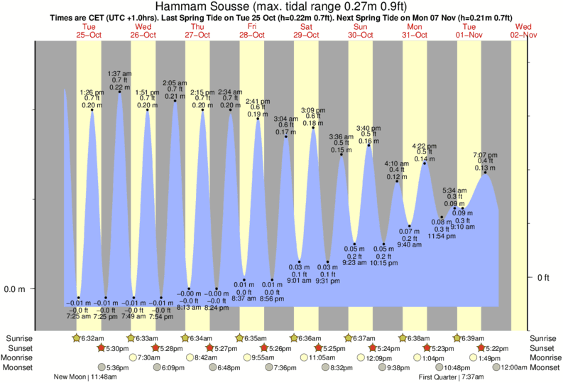 Tide Times are CET (UTC +1.0hrs). Last Spring High Tide at Hammam Sousse was on Mon 08 Dec (height: 0.20m 0.7ft). Next high Spring Tide at Hammam Sousse will be on Sun 21 Dec (height: 0.20m 0.7ft).