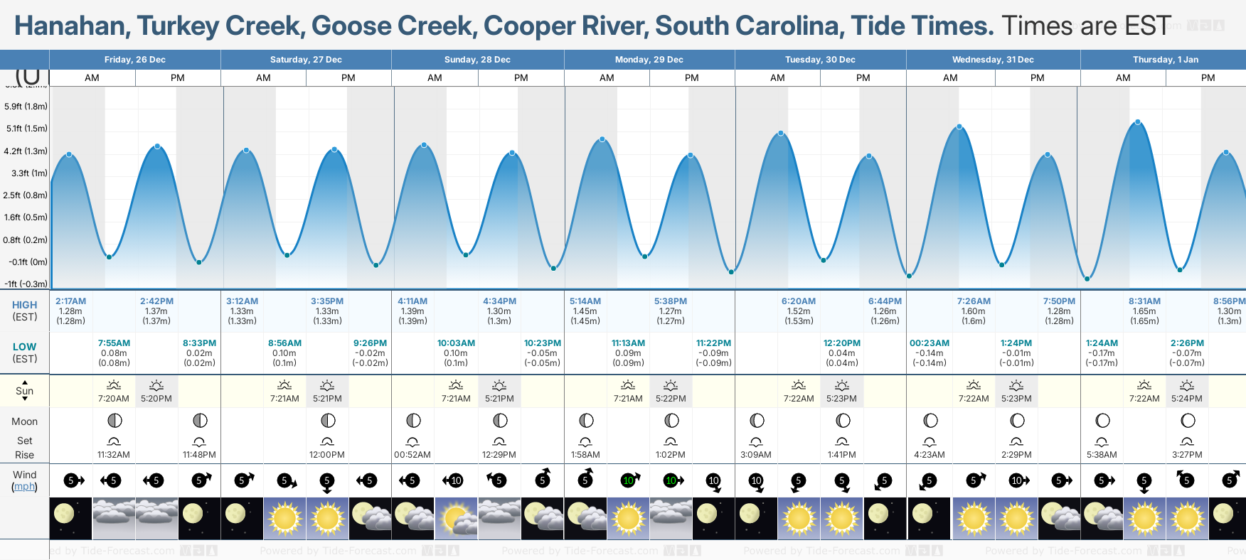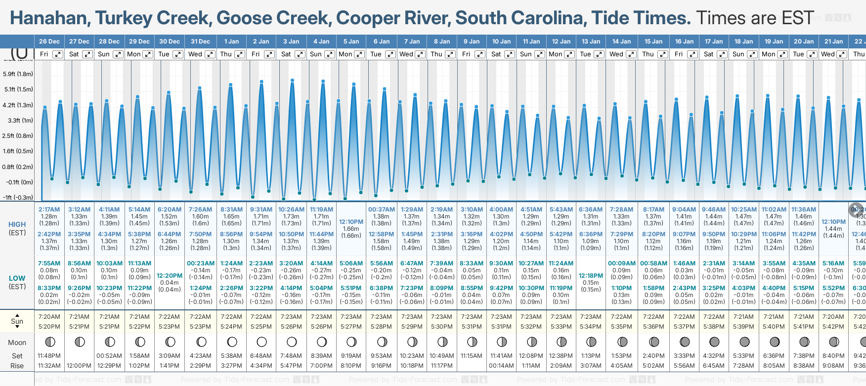 December and January Tide charts for Hanahan, Turkey Creek, Goose Creek, Cooper River: The tide charts below show the height, time and date of high and low tides for the next 30 days.