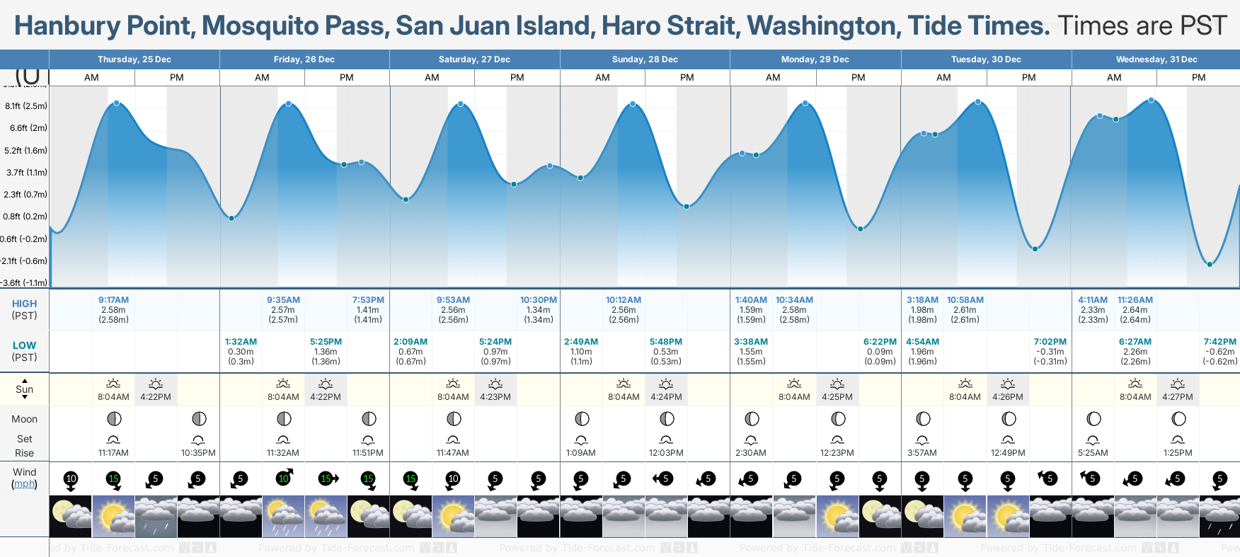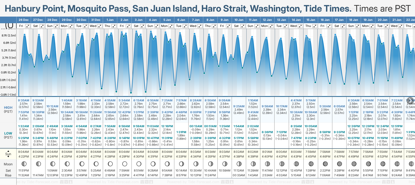 December and January Tide charts for Hanbury Point, Mosquito Pass, San Juan Island, Haro Strait: The tide charts below show the height, time and date of high and low tides for the next 30 days.