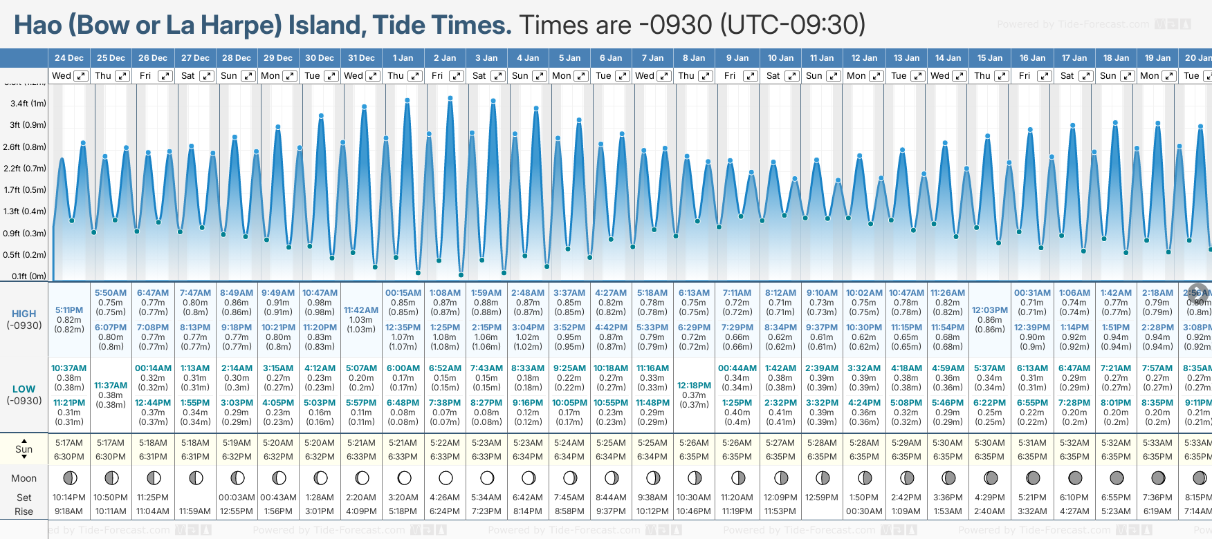 December and January Tide charts for Hao (Bow or La Harpe) Island: The tide charts below show the height, time and date of high and low tides for the next 30 days.