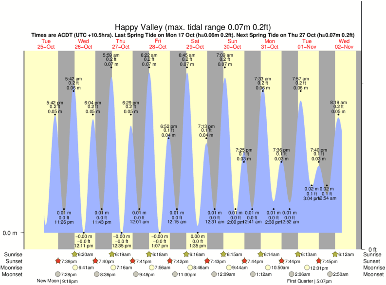 Tide Times are ACDT (UTC +10.5hrs). Last Spring High Tide at Happy Valley was on Fri 19 Dec (height: 0.06m 0.2ft). Next high Spring Tide at Happy Valley will be on Fri 26 Dec (height: 0.06m 0.2ft).