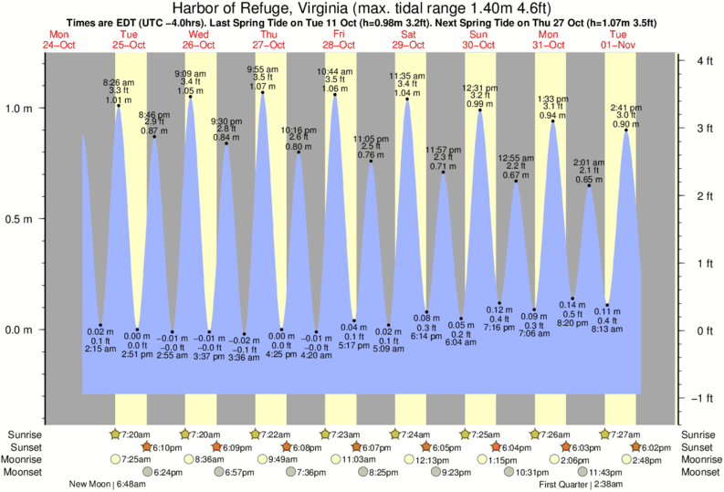 Harbor of Refuge tide chart key: The tide chart above shows the height and times of high tide and low tide for Harbor of Refuge, Virginia. The grey shading corresponds to nighttime hours between sunset and sunrise at Harbor of Refuge.