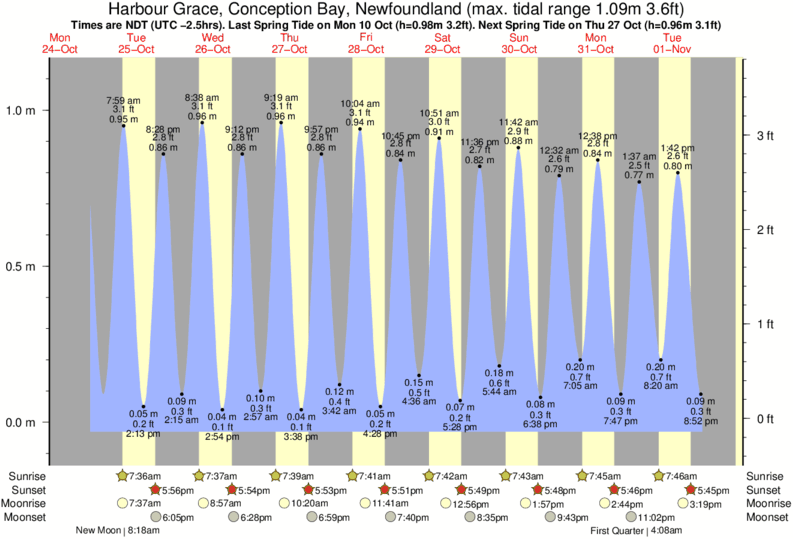 Harbour Grace, Conception Bay tide chart key: The tide chart above shows the height and times of high tide and low tide for Harbour Grace, Conception Bay, Newfoundland. The grey shading corresponds to nighttime hours between sunset and sunrise at Harbour Grace, Conception Bay.
