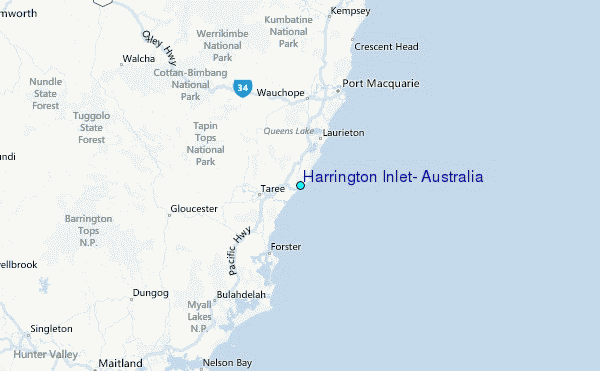Use this relief map to navigate to tide stations, surf breaks and cities that are in the area of Harrington Inlet, Australia.