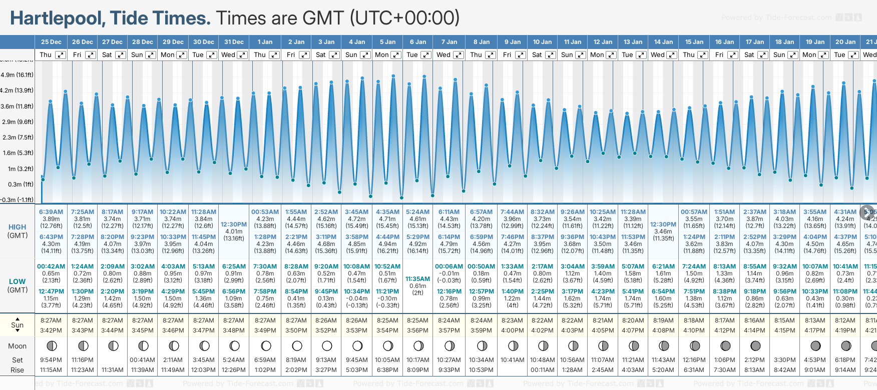 December and January Tide charts for Hartlepool: The tide charts below show the height, time and date of high and low tides for the next 30 days.