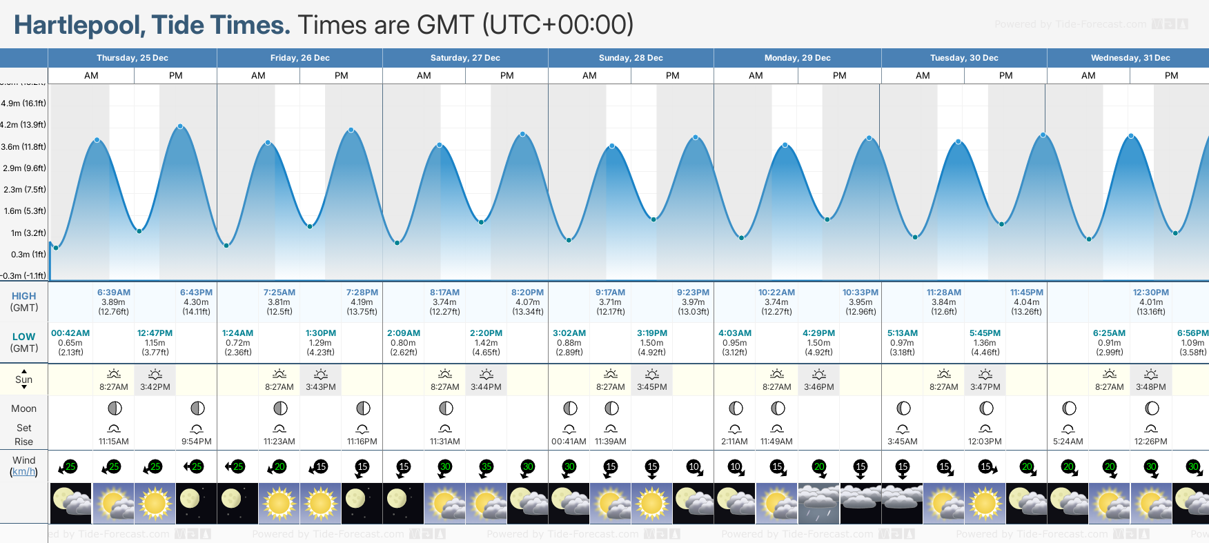Tide chart for HartlepoolShowing low and high tide times for the next 30 days at Hartlepool. Tide Times are GMT (UTC +0hrs).