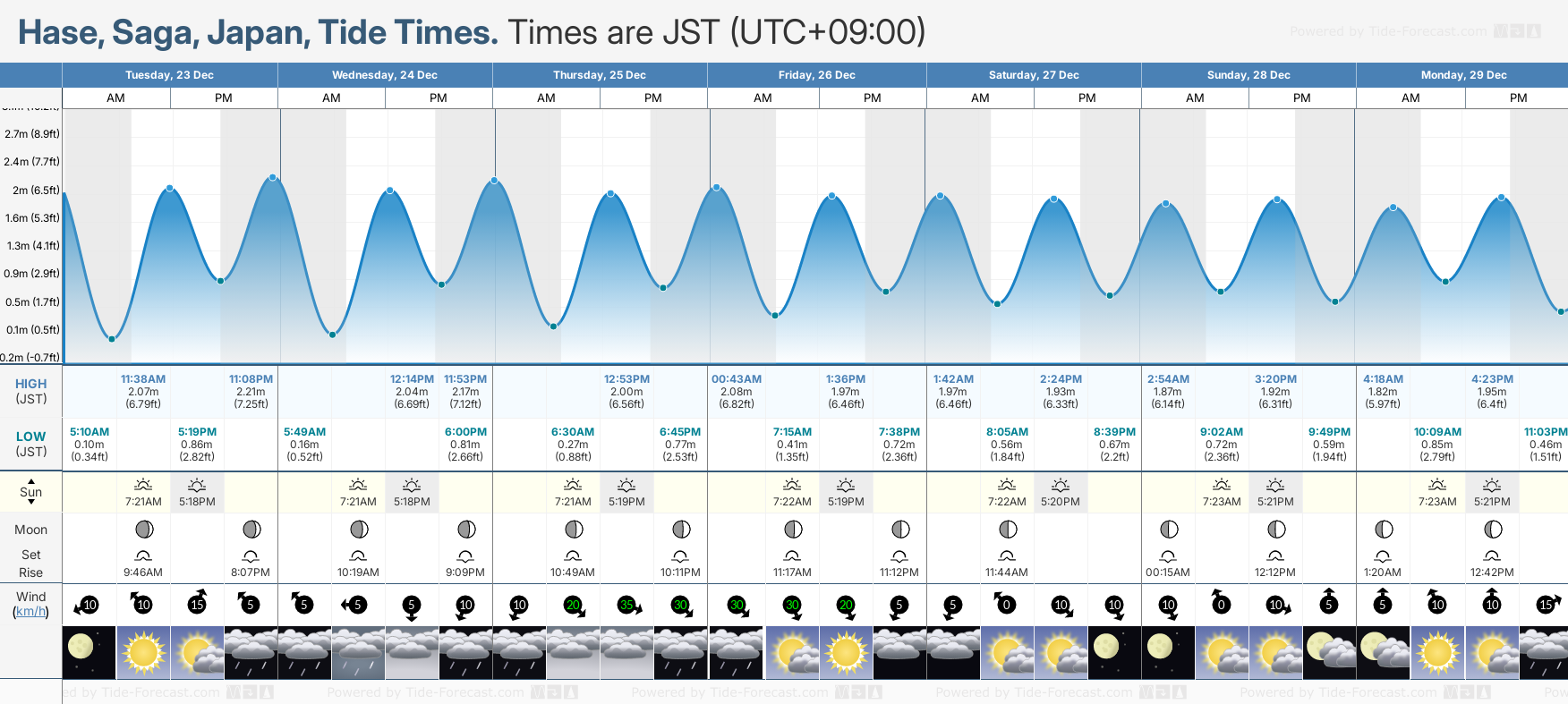 Tide Times are JST (UTC +9.0hrs). Last Spring High Tide at Hase was on Sat 06 Dec (height: 2.55m 8.4ft). Next high Spring Tide at Hase will be on Tue 23 Dec (height: 2.23m 7.3ft).