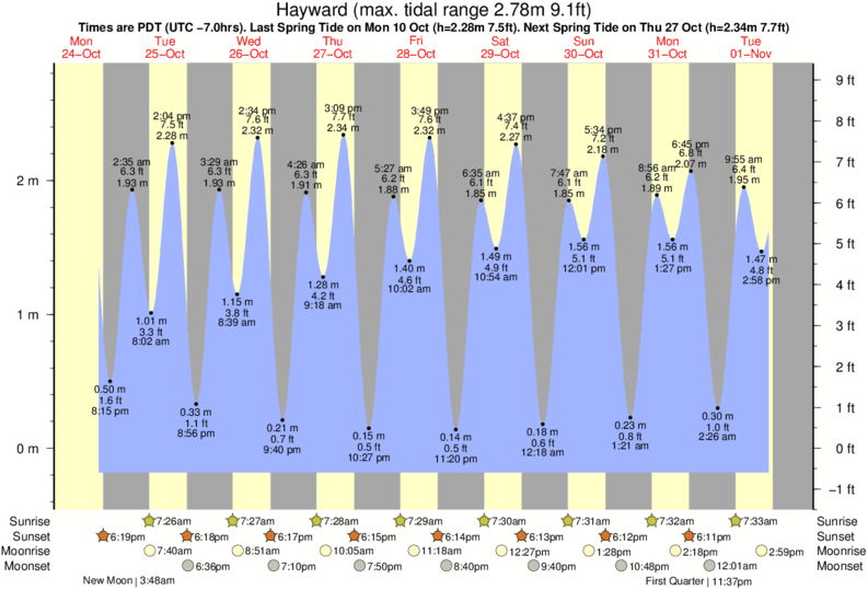 Tide Times are PST (UTC -8.0hrs). Last Spring High Tide at Hayward was on Fri 05 Dec (height: 2.61m 8.6ft). Next high Spring Tide at Hayward will be on Sat 20 Dec (height: 2.28m 7.5ft).
