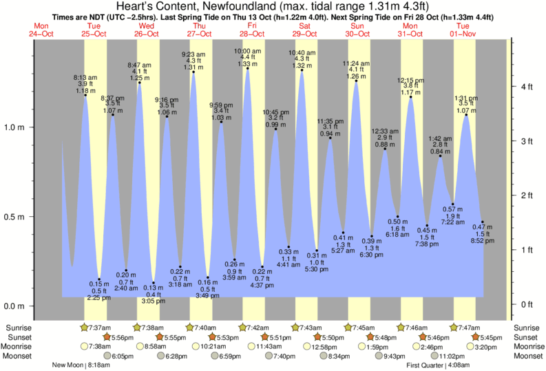 Tide chart for Heart's ContentShowing low and high tide times for the next 30 days at Heart's Content. Tide Times are NST (UTC -3.5hrs).