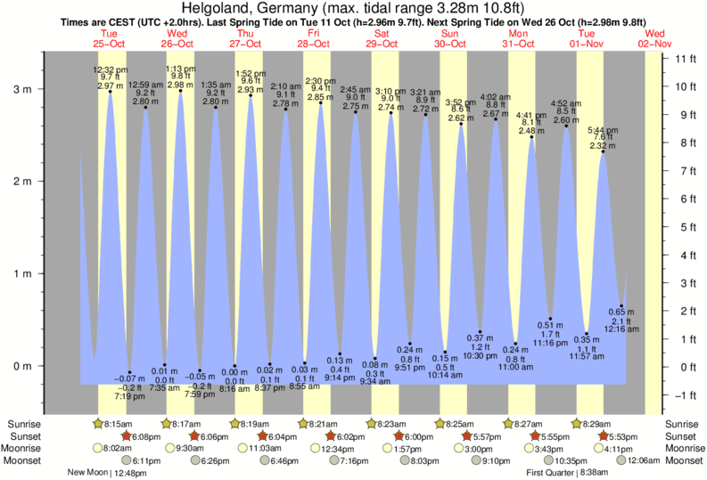 December and January Tide charts for Helgoland: The tide charts below show the height, time and date of high and low tides for the next 30 days.