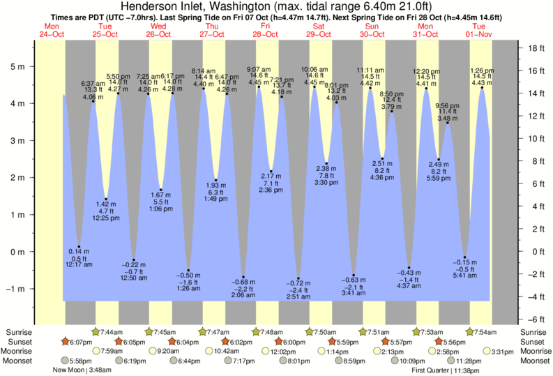Tide Times are PST (UTC -8.0hrs). Last Spring High Tide at Henderson Inlet was on Sun 07 Dec (height: 4.97m 16.3ft). Next high Spring Tide at Henderson Inlet will be on Wed 24 Dec (height: 4.78m 15.7ft).
