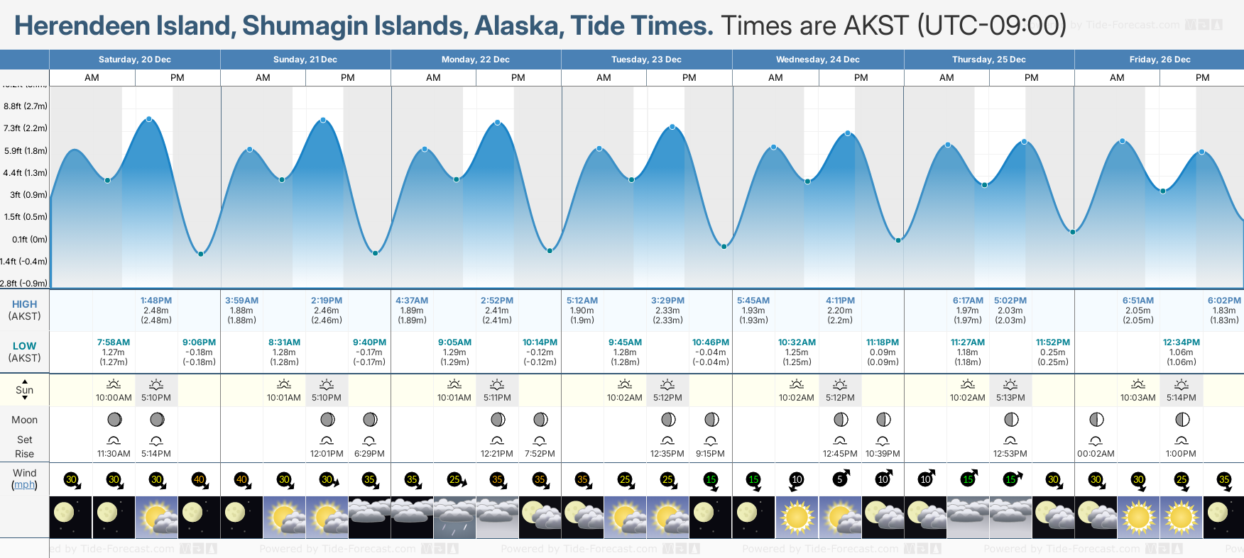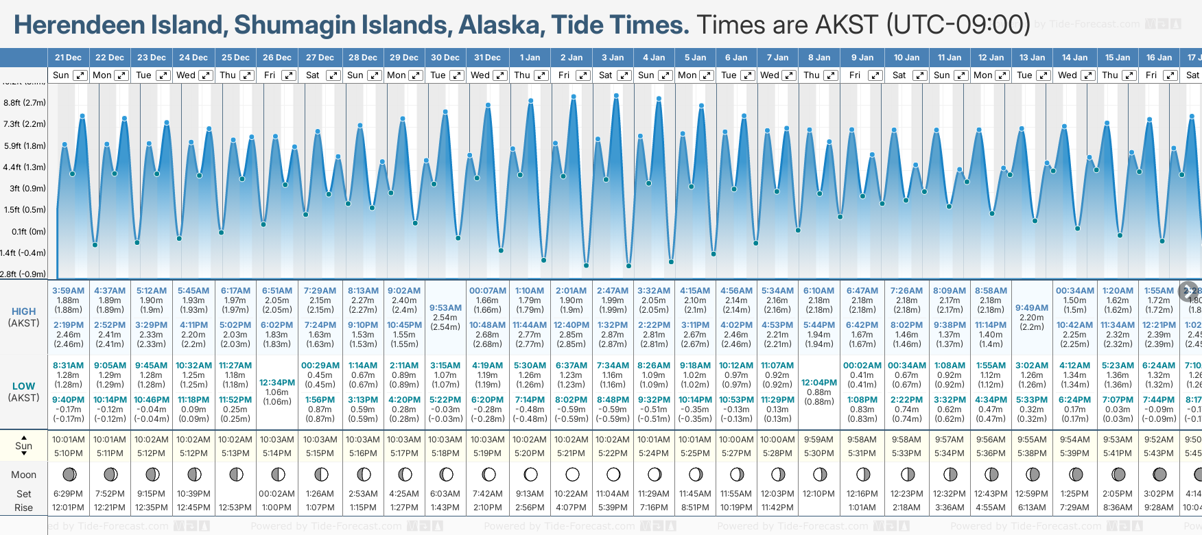 December and January Tide charts for Herendeen Island, Shumagin Islands: The tide charts below show the height, time and date of high and low tides for the next 30 days.