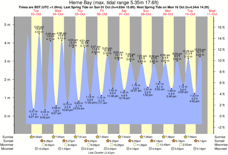 Tide Times are GMT (UTC +0hrs). Last Spring High Tide at Herne Bay was on Sat 06 Dec (height: 4.50m 14.8ft). Next high Spring Tide at Herne Bay will be on Wed 24 Dec (height: 4.01m 13.2ft).