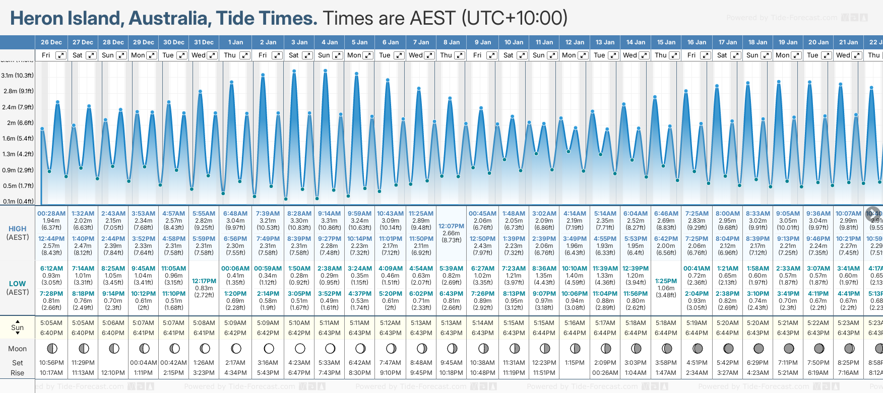 December and January Tide charts for Heron Island: The tide charts below show the height, time and date of high and low tides for the next 30 days.