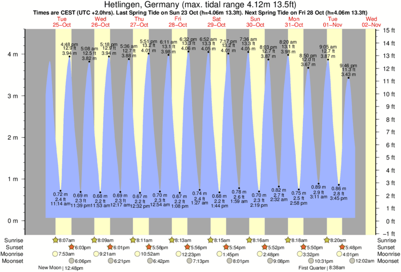 Tide Times are CET (UTC +1.0hrs). Last Spring High Tide at Hetlingen was on Sun 07 Dec (height: 3.97m 13.0ft). Next high Spring Tide at Hetlingen will be on Mon 22 Dec (height: 4.00m 13.1ft).