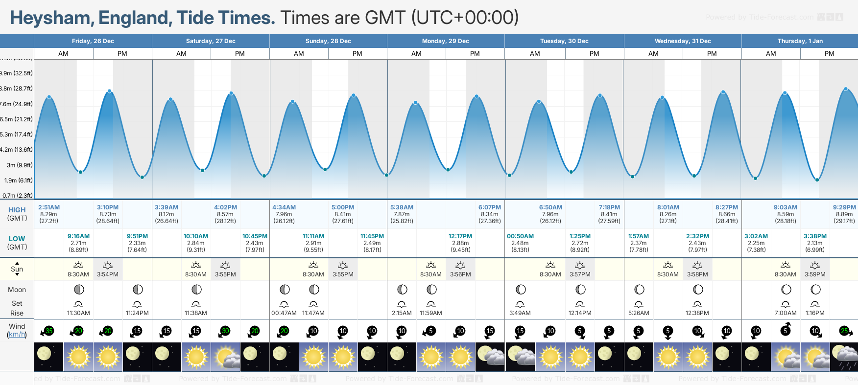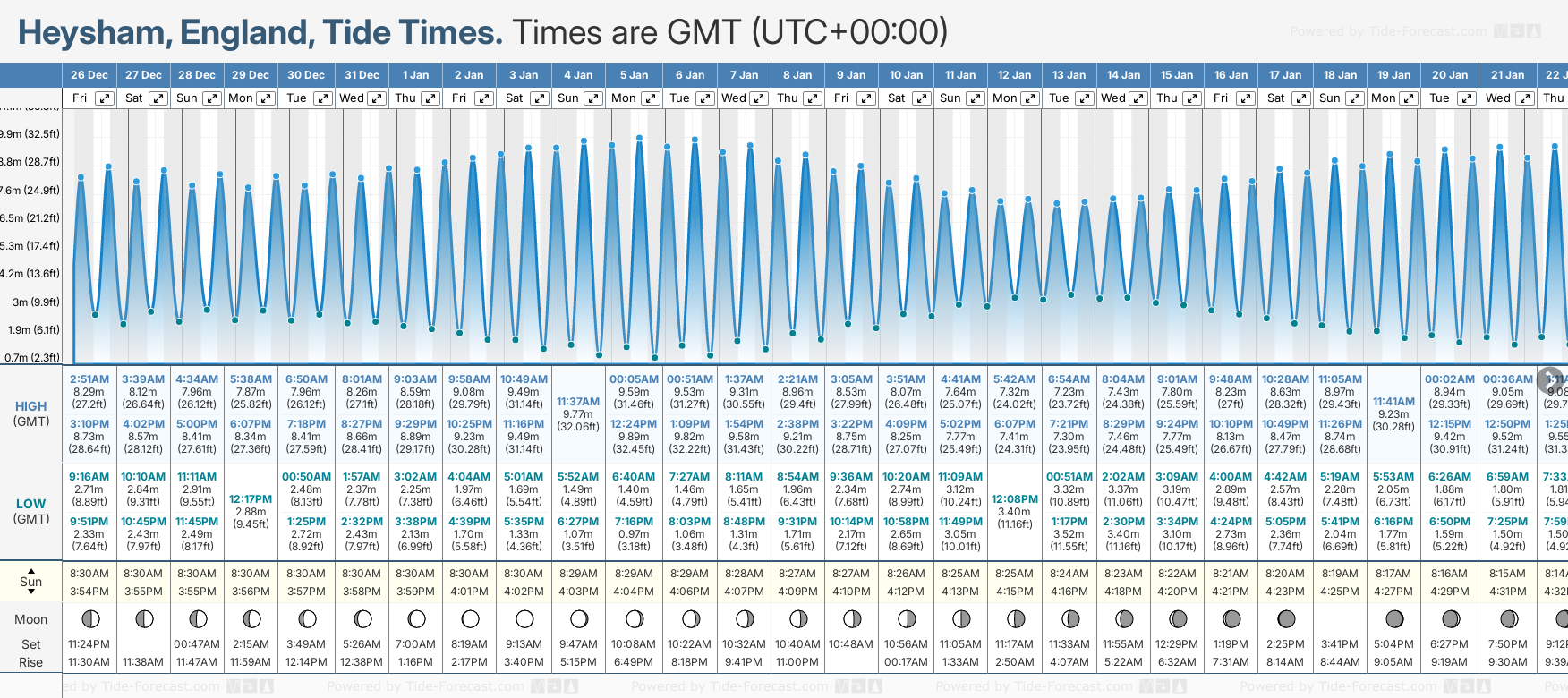 December and January Tide charts for Heysham: The tide charts below show the height, time and date of high and low tides for the next 30 days.