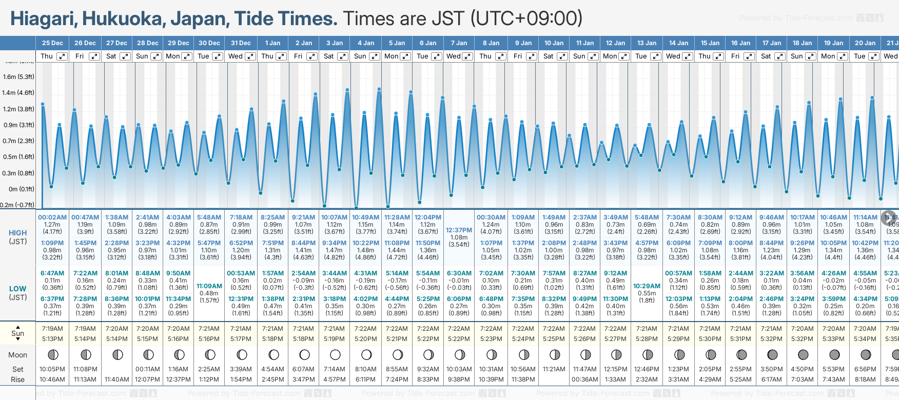 Hiagari tide chart key: The tide chart above shows the height and times of high tide and low tide for Hiagari, Hukuoka, Japan. The grey shading corresponds to nighttime hours between sunset and sunrise at Hiagari.