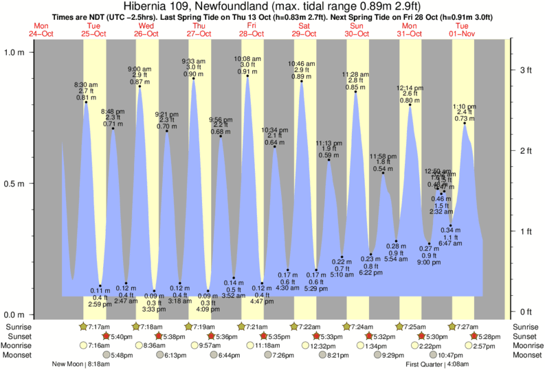 Tide Times are NST (UTC -3.5hrs). Last Spring High Tide at Hibernia 109 was on Sun 07 Dec (height: 0.94m 3.1ft). Next high Spring Tide at Hibernia 109 will be on Sun 21 Dec (height: 0.85m 2.8ft).