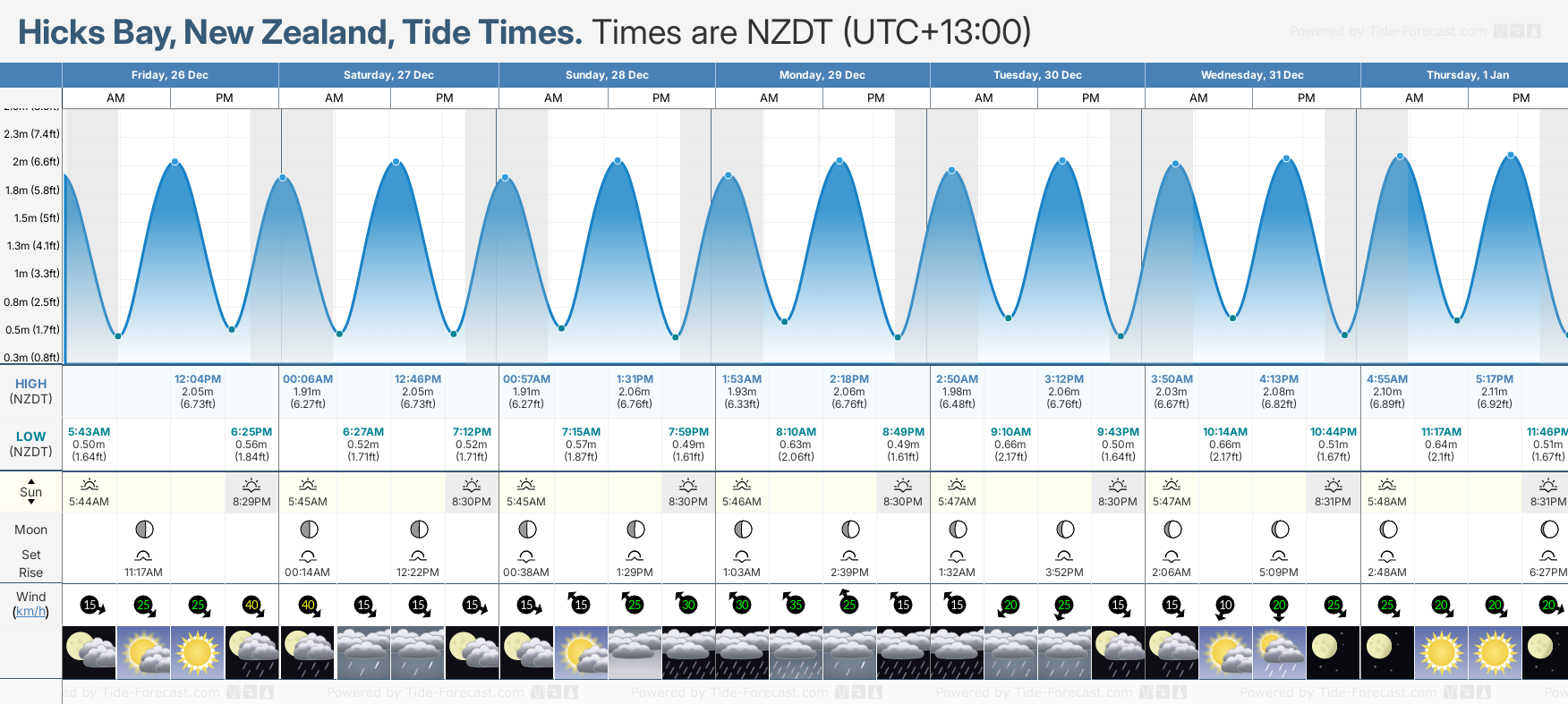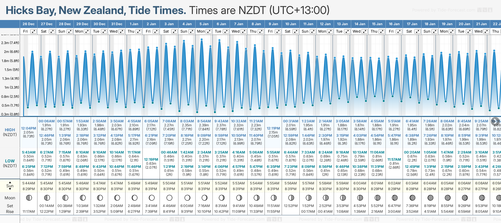 December and January Tide charts for Hicks Bay: The tide charts below show the height, time and date of high and low tides for the next 30 days.