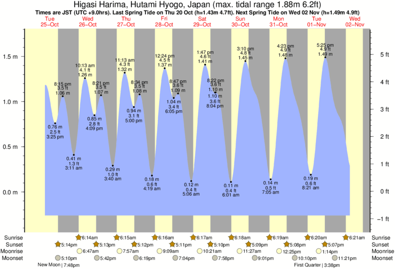 Tide Times are JST (UTC +9.0hrs). Last Spring High Tide at Higasi Harima was on Sat 06 Dec (height: 1.40m 4.6ft). Next high Spring Tide at Higasi Harima will be on Sat 03 Jan (height: 1.35m 4.4ft).