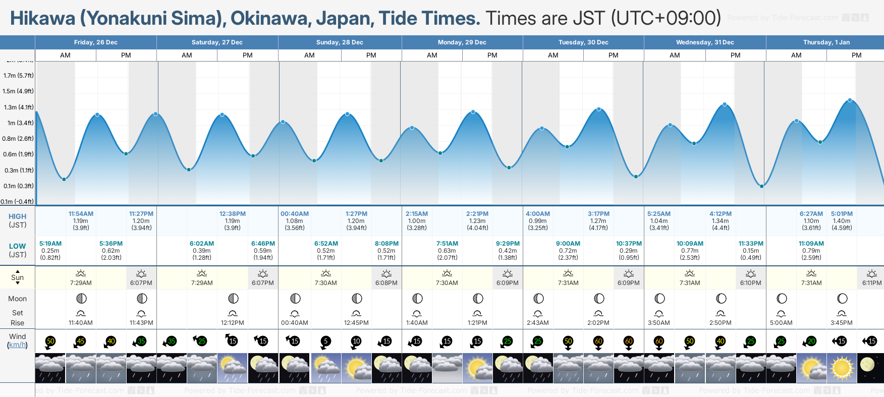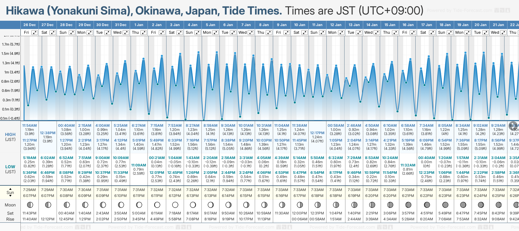 December and January Tide charts for Hikawa (Yonakuni Sima): The tide charts below show the height, time and date of high and low tides for the next 30 days.