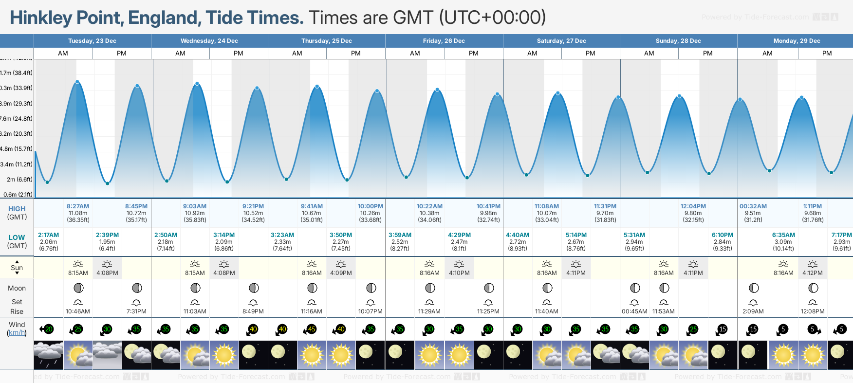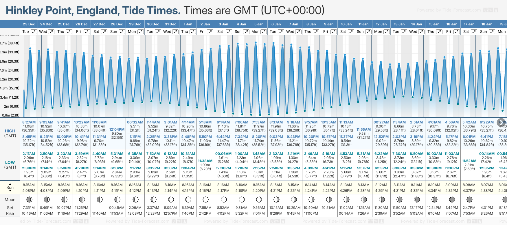 December and January Tide charts for Hinkley Point: The tide charts below show the height, time and date of high and low tides for the next 30 days.