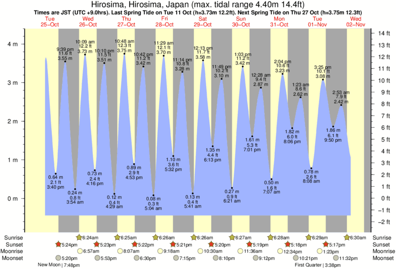 Tide Times are JST (UTC +9.0hrs). Last Spring High Tide at Hirosima was on Sat 06 Dec (height: 3.75m 12.3ft). Next high Spring Tide at Hirosima will be on Mon 22 Dec (height: 3.38m 11.1ft).