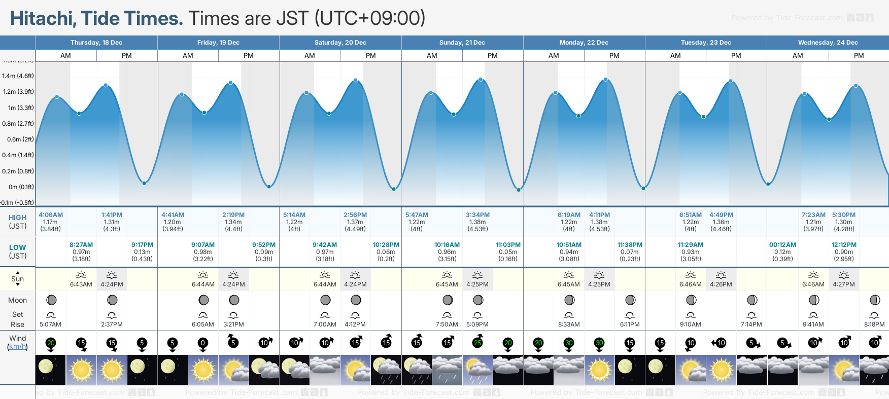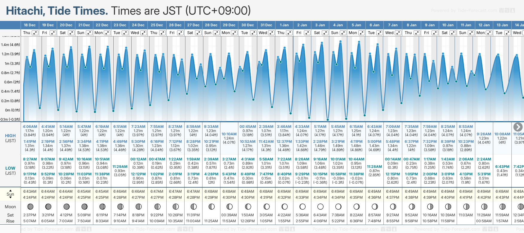 December and January Tide charts for Hitachi: The tide charts below show the height, time and date of high and low tides for the next 30 days.