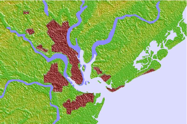 Use this relief map to navigate to tide stations, surf breaks and cities that are in the area of Hobcaw Point, Wando River, South Carolina.