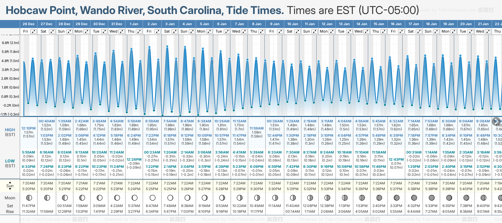 December and January Tide charts for Hobcaw Point, Wando River: The tide charts below show the height, time and date of high and low tides for the next 30 days.