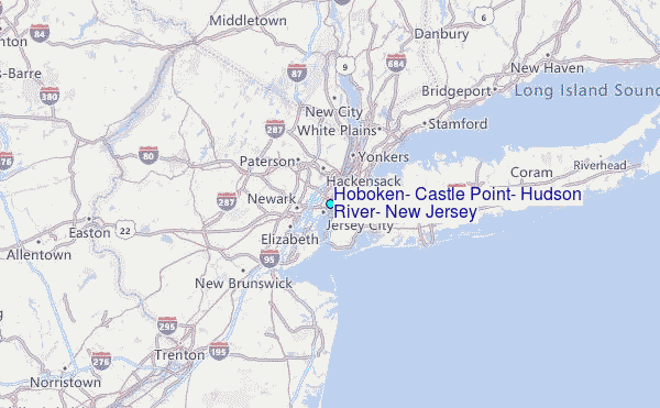 Use this relief map to navigate to tide stations, surf breaks and cities that are in the area of Hoboken, Castle Point, Hudson River, New Jersey.