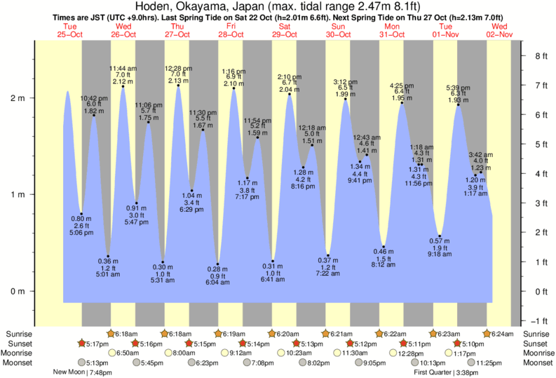 Tide Times are JST (UTC +9.0hrs). Last Spring High Tide at Hoden was on Sun 21 Dec (height: 2.10m 6.9ft). Next high Spring Tide at Hoden will be on Sun 04 Jan (height: 2.08m 6.8ft).